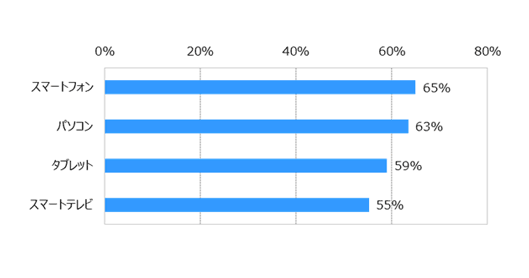 ※2か月に一回以上動画コンテンツを視聴するユーザー。動画コンテンツを最も視聴している端末が、パソコン、タブレット、スマートフォン、スマートテレビであるユーザーを134名ずつ恣意的に均等割り付けで収集し、その合計を調査母数として設定。