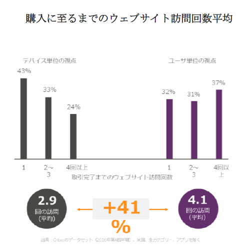 購入に至るまでのサイトの訪問回数をデバイス単位とユーザー単位で比較してみたところ、デバイス単位では平均回数が2.9回に対して、ユーザー単位では4.1回と41%多くなっている。