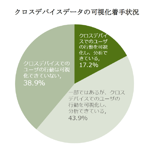 PCやモバイル、タブレットといった複数のデバイス(クロスデバイス)でのユーザ行動の可視化ができていると回答したのは17.2%、一部できていると回答したのは43.9%。一方、クロスデバイスでのユーザ行動は可視化できていないは38.9%という結果に。