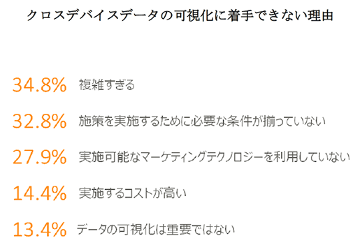 クロスデバイスでのユーザ行動データを可視化できていない理由の上位には、「複雑すぎる」「実施のための必要条件が揃っていない」「簡単に実施できるマーケティングテクノロジーを使用していない」などが続く。