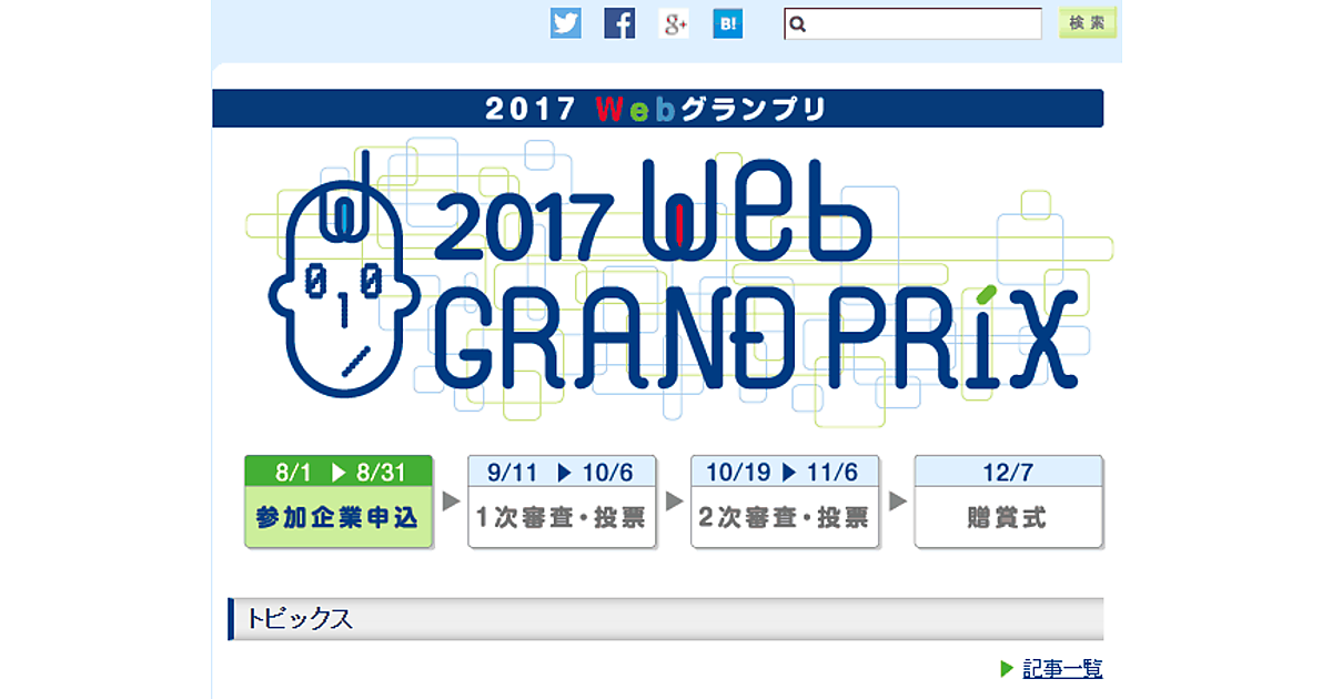 参加費は5万円で、1社につき3サイトまで応募可能。サイト登録後に、5名以上10名以内の審査委員を登録する必要がある。9月から10月にかけて一次審査、10月から11月にかけて二次審査が行われ、12月7日(木)に贈賞式が予定されている。