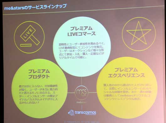 me&starsでは、影響力のあるインフルエンサーを通じて、まだ世の中にないプレミアムなモノとコト(体験)をライブ動画を通じて販売していく。トランスコスモスのDEC(Digital Marketing/EC/Contact Center)サービスがバックエンドをサポートする。