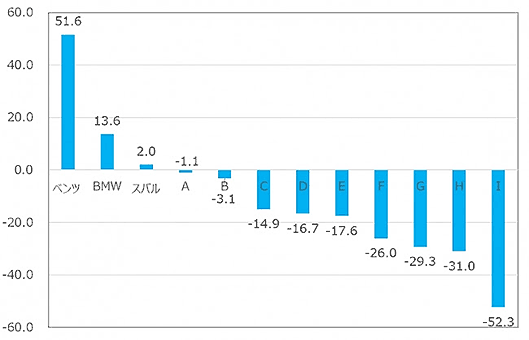 NPSが1位となったのは、「メルセデス・ベンツ」で、NPSスコア:51.6と、他と比較し突出して高い値であった。