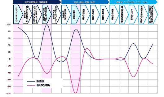 Emotion Tech社がもつ特許技術(統計解析手法)を用いることにより、NPS対する影響を示す「重要度」(グラフ上青線)、NPSをどの程度向上・低下させているかを示す「現状の評価」(グラフ上赤線)を算出した。