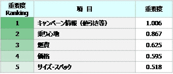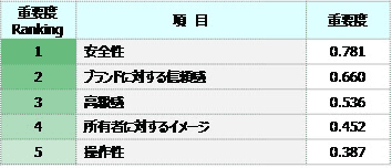 「ブランドイメージ」については、「安全性」が最も高く、「安全性」の向上が、ブランドイメージの向上につながるといえる(表4)。