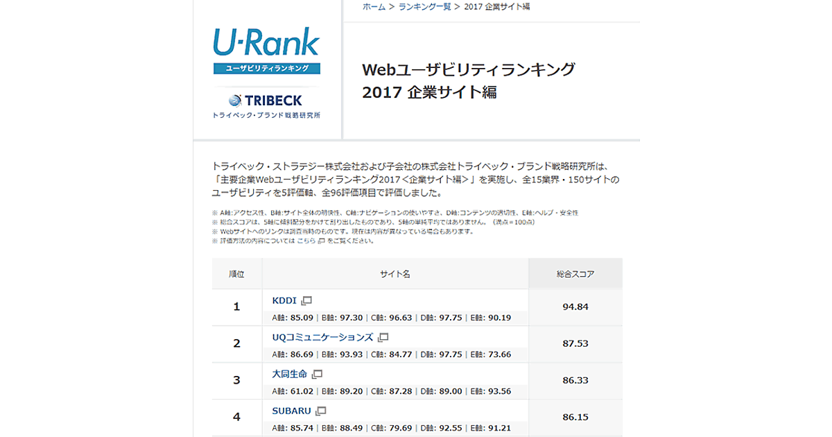 デジタルマーケティング支援のトライベック・ストラテジーおよび子会社のトライベック・ブランド戦略研究所は、「主要企業Webユーザビリティランキング2017<企業サイト編>」の調査結果を11月21日に発表した。1位は4年連続でKDDIのWebサイトだった。