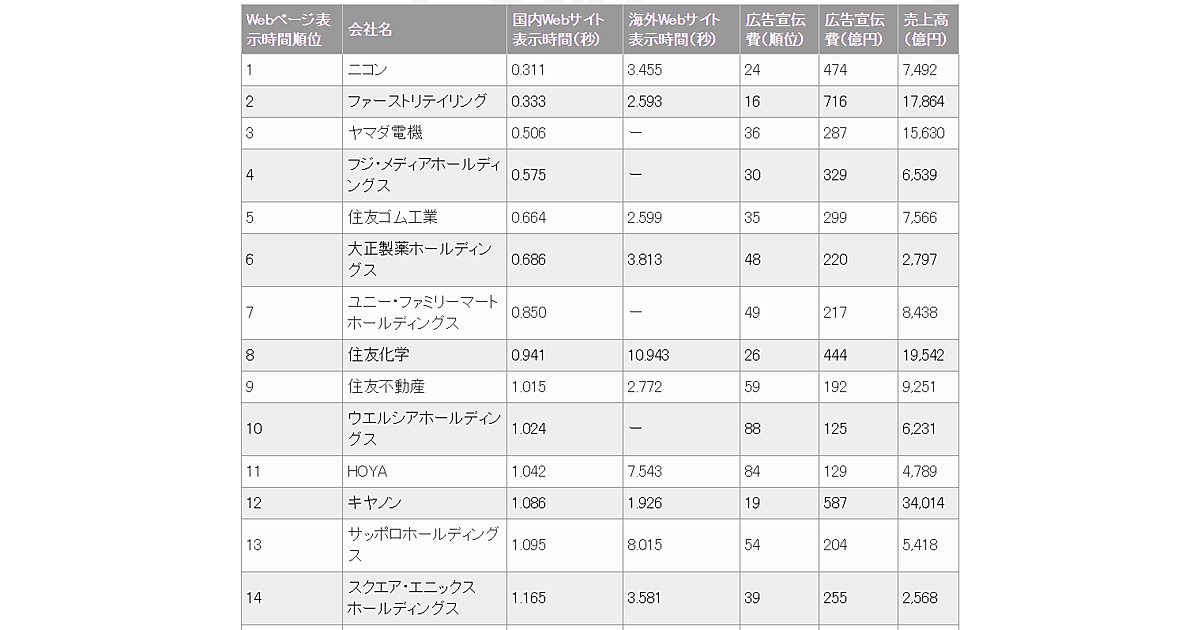 | Webページ表示時間順位 | 会社名 | 国内Webサイト表示時間(秒) | 海外Webサイト表示時間(秒) | 広告宣伝費(順位) | 広告宣伝費(億円) | 売上高(億円) |