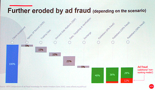 広告主が投資した広告費のうち60%は代理店やDSPなどに消え、さらにそこからアドフラウドで10~30%ほど消えていき、最終的にコンテンツ提供元のパブリッシャーには28%しか残らないという事実がすでに2014年のデータで明らかになっている。