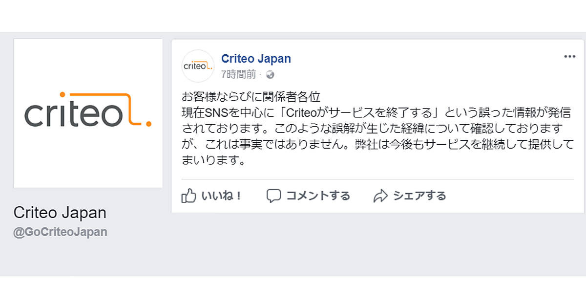 現在SNSを中心に「Criteoがサービスを終了する」という誤った情報が発信されております。このような誤解が生じた経緯について確認しておりますが、これは事実ではありません。弊社は今後もサービスを継続して提供してまいります。