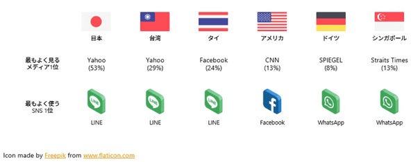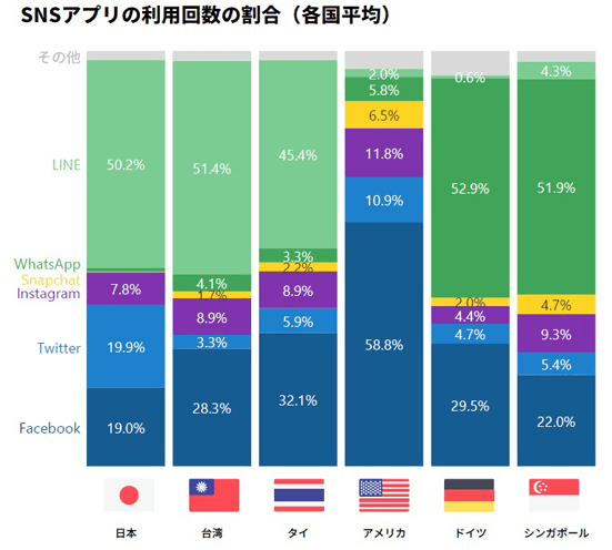 日本、台湾、タイではLINE、アメリカではFacebook、ドイツとシンガポールではWhatsAppがよく利用されている。また日本(およびアメリカ)以外の国ではFacebookが2位となっており、日本におけるTwitterの利用状況は他国と比較して突出している。