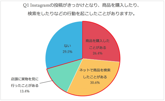 「Instagramの投稿がきっかけとなり、商品を購入したり、検索をしたりなどの行動を起こしたことがありますか」との質問に対して、「商品を購入したことがある」と回答した人は26.4%。