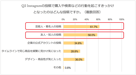 「Instagramの投稿で購入や検索などの行動を起こすきっかけとなったのはどんな投稿か」を複数回答で尋ねたところ、「芸能人・著名人の投稿」と回答した人が61.7%と最も多く、次いで「友人・知人の投稿」と回答した人が58.0%となった。「企業の公式アカウントの投稿」は34.8%にとどまっている。