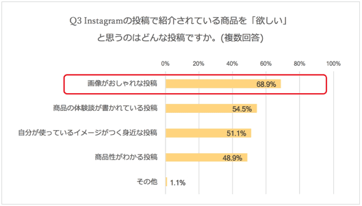 「Instagramの投稿で紹介されている商品を『欲しい』と思うのはどんな投稿か」を複数回答で尋ねたところ、「画像がおしゃれな投稿」が68.9%で最多となった。「商品の体験談が書かれている投稿」(54.5%)、「自分が使っているイメージがつく身近な投稿」(51.1%)も5割を超えている。