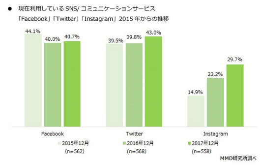 一方、Instagramを「現在利用している」という回答は前年から6.5ポイント増加し、29.7%となった。Instagramは2015年から2016年にかけても8.3ポイント増加しており、急速にユーザー層を拡大しているようすが見てとれる。