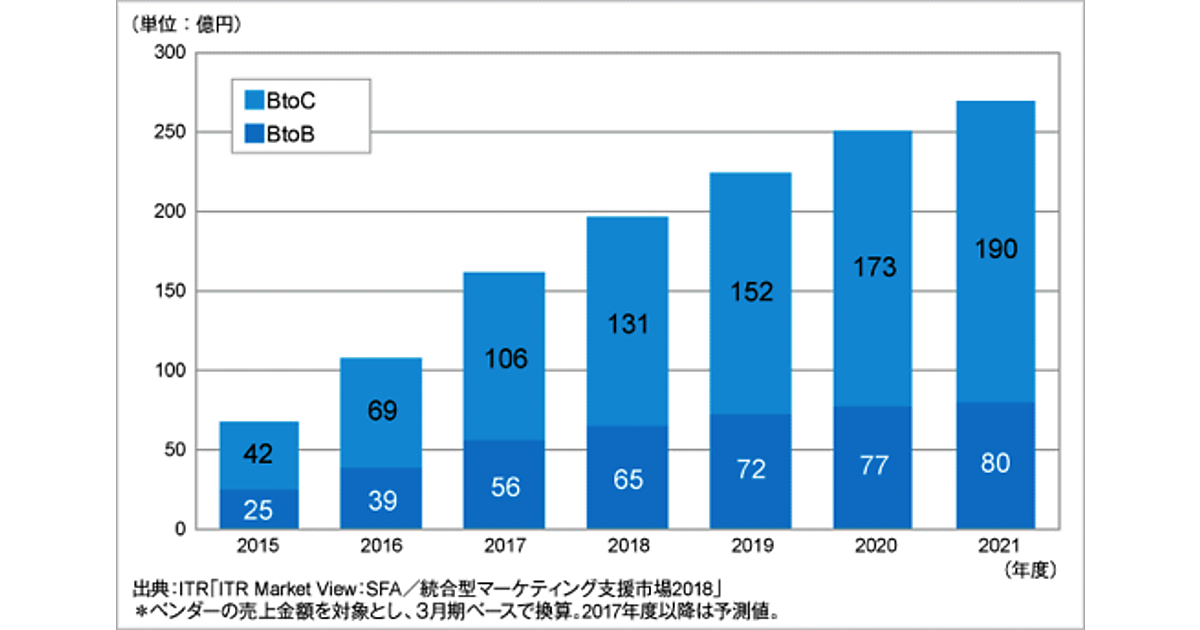 またITRではこの市場を、法人間で行われる取引のマーケティング活動を支援する「BtoB向け」市場(グラフの濃い青)と、法人と個人消費者の間で行われる取引のマーケティング活動を支援する「BtoC向け」市場(同、薄い青)に分けて算出している。