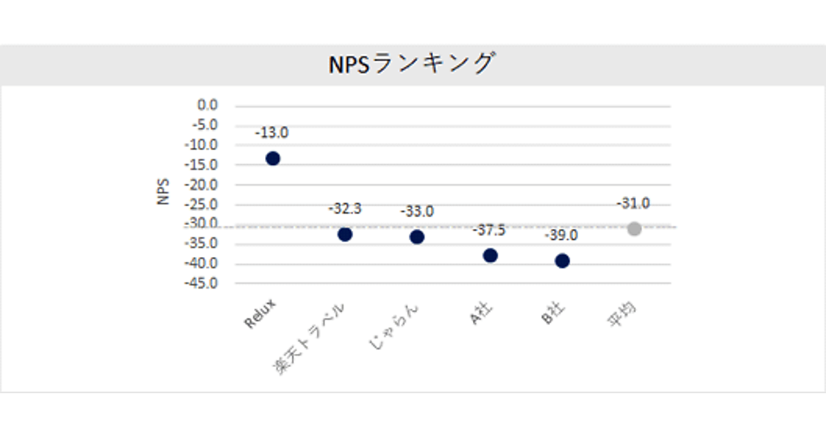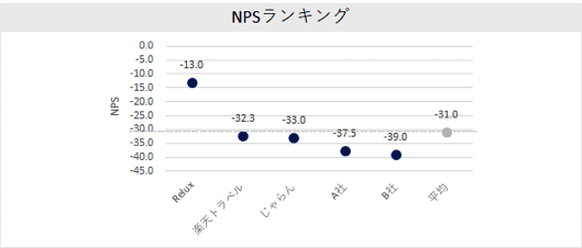 調査対象となった5サービスの中で、NPSが最高となったのはReluxの-13.0であった。5サービスの平均NPSは-31.0。