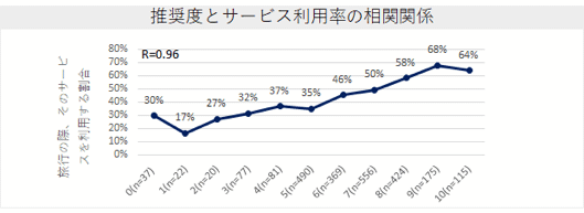 下図は、各サービスに対する推奨意向(0~10)とサービス利用率※の相関関係を図示したもの。この2変数の間の相関係数(R)は0.96で、強い相関を示している。