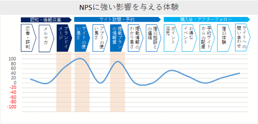 オンライン旅行サービスにおけるNPSの向上に関して、各顧客体験がどの程度重要か(影響しているか)をグラフ化したものが下図。縦軸は各体験のNPS向上における重要度合い(影響力の強さ)を示しており、横軸は時系列で認知段階から購入後までの顧客体験を並べている。