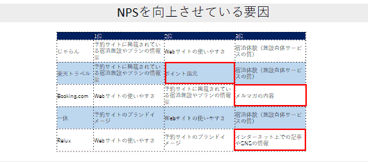 この結果から両社では、オンライン旅行サービスにおけるNPS向上には「Webサイトの使いやすさ」、「予約サイトに掲載されている宿泊施設のプランの情報量」、「予約サイトのブランドイメージ」が重要であるとしている。