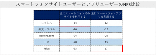 オンライン旅行サービスを、主にスマートフォン向けサイトで利用するユーザーと、主にアプリで利用するユーザーに分けてNPSを比較した結果、「スマートフォンサイトが最も評価されているのはじゃらん、アプリが最も評価されているのはReluxという結果になった」(両社)。