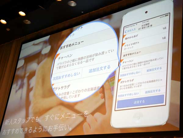 また、座席ごとの注文内容に応じたおすすめメニューを説明文とともに表示したり、料理提供の時間が遅れている注文を赤く表示したりするなど、飲食店の業務効率化とQSC(Quality Service Cleanliness)改善を支援する。