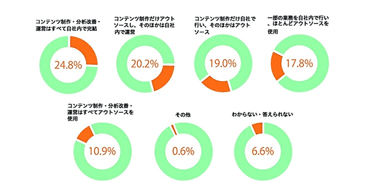 コンテンツマーケティングの運営体制について聞いたところ、「コンテンツ制作・分析改善・運営はすべて自社内で完結」が24.8%だった。続いて「コンテンツ制作だけアウトソースし、そのほかは自社内で運営」が20.2%。「コンテンツ制作だけ自社で行い、そのほかはアウトソース」が19.0%という結果だった。