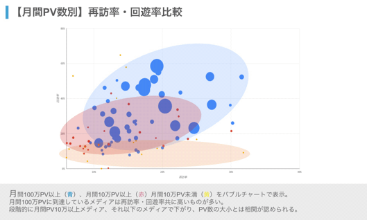 メディアサイトを月間100万PV以上(青)、月間10万PV以上(赤)、月間10万PV未満(黄)の3グループに分け、横軸に再訪率、縦軸に回遊率をとったものがこちら。各バブルの大きさはPVを示す。