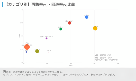 メディアの再訪率・回遊率は、取り扱うカテゴリーによって大きな差が見られた。特にビジネス、エンタメ、趣味・ホビーのカテゴリーで高く、ニュースポータルやグルメ、旅行のカテゴリーで低い傾向があった。