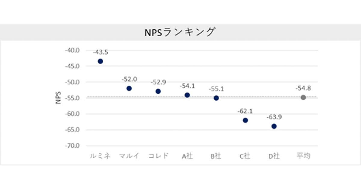 今回調査対象となった7社(マルイ、109、パルコ、アトレ、ミロード、ルミネ、コレド)の平均NPSは-54.8で、最高はルミネの-43.5であった。