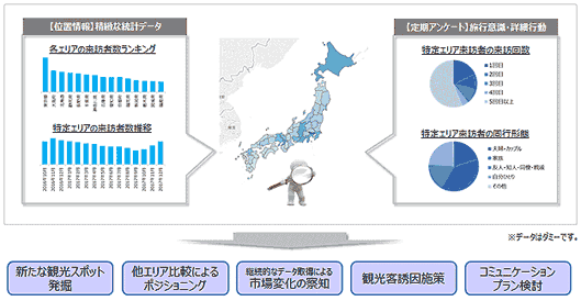うごキットのデータ活用例として、精緻なデータをもとにしたデータドリブンマーケティング、国内旅行・観光市場の動向把握、エリア来訪者数や消費金額などの観光地評価、広告配信におけるターゲティング精度の向上、生活者の理解などが挙げられる。