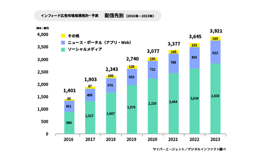 サイバーエージェントはデジタルインファクトと共同で国内のインフィード広告に関する市場動向調査を実施。2023年までの市場規模を推計・予測した。
