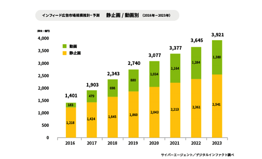 サイバーエージェントはデジタルインファクトと共同で国内のインフィード広告に関する市場動向調査を実施。プロモーション目的や配信先デバイス、配信先メディア、広告フォーマットなどを含めて推計するとともに、2023年までの市場規模を予測した。