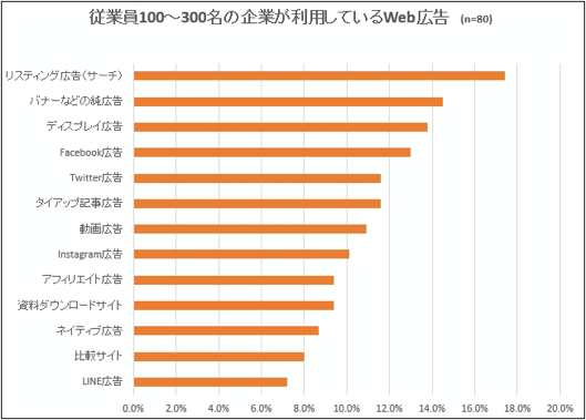 同じ質問に対する結果を、従業員数100名~300名の企業に絞り込んで見てみると、上位は「リスティング広告」「バナーなどの純広告」「ディスプレイ広告」となり、顔ぶれは変わらないが順位が入れ替わっている(回答者数は80)。