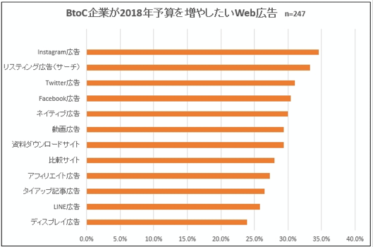 2018年に予算を増やしたいWeb広告を聞いたところ、B2C企業、B2B企業ともにInstagram広告が上位に入った。B2B企業における1位が「比較サイト」(74.1%)となっている点も興味深い。