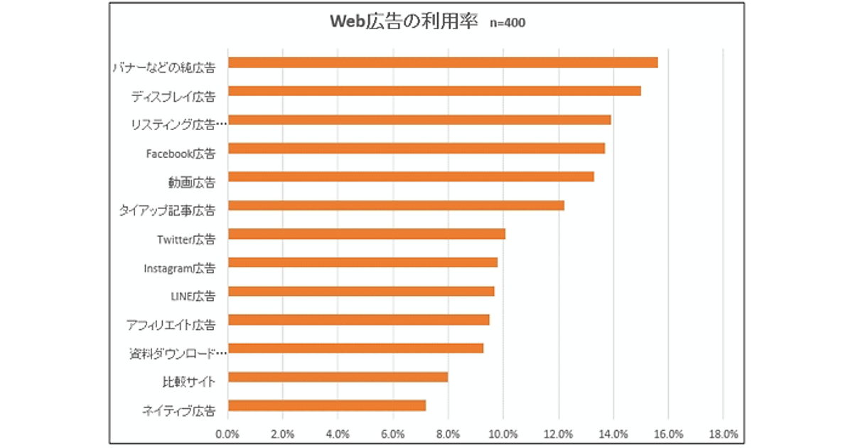 現在担当している商品・サービスで利用しているWeb広告を聞いたところ、「バナーなどの純広告」(15.6%)、「ディスプレイ広告」(15.0%)、「リスティング広告」(13.9%)が上位に入った。