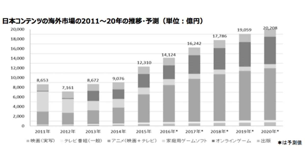 海外に進出した日本コンテンツの市場規模は、2011年の8,653億円から2016年には1兆4,124億円に増加したと推計。2020年には2兆208億円まで拡大すると予測している。
