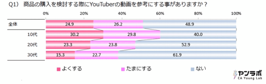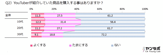 「YouTuberが紹介していた商品を購入し友達に勧めたことがあるか」という問いに対して、10代20代ともに3割が「ある」と回答。CA Young Labでは「YouTuberの動画が商品のクチコミを派生するきっかけになり得る」と考察している。