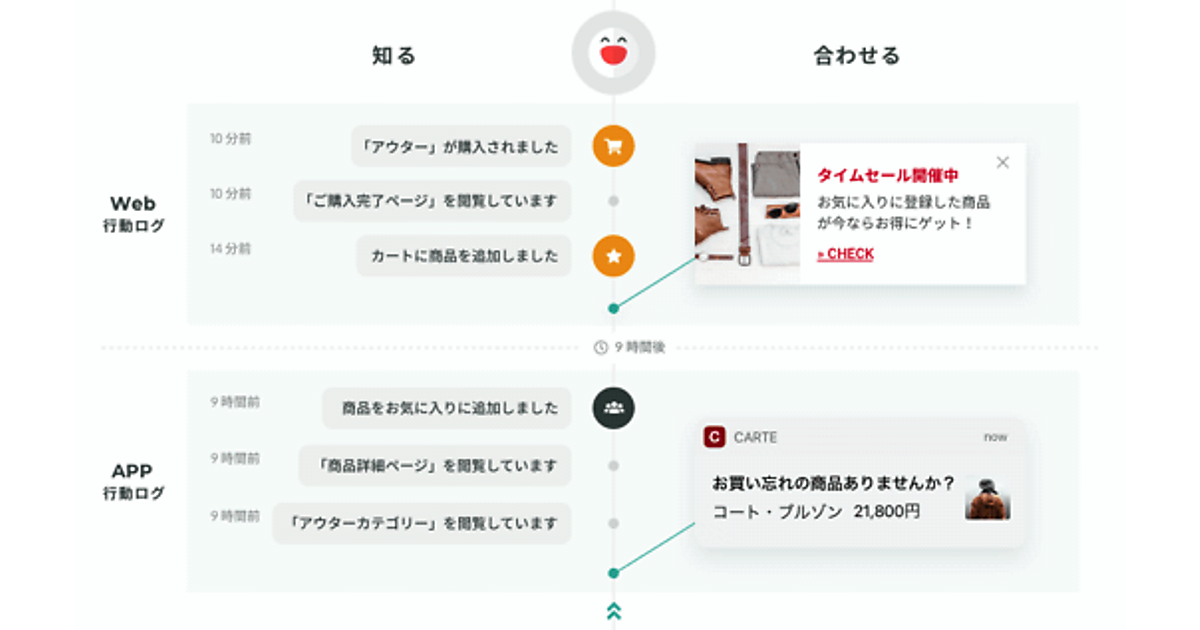 Webサイトに「KARTE」を導入している場合、共通の管理画面からWebとアプリ双方のユーザー行動データを解析することができる。Webサイトで商品をカートに追加後に離脱してしまったユーザーに対し、アプリプッシュ通知で購入リマインドを送ったり、Webサイトに高い頻度で来訪しているがアプリをまだインストールしていない人にアプリをお勧めしたりといった、横断データを活用した施策が可能