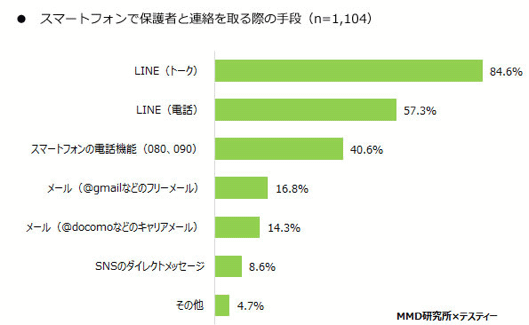 「あなたがスマートフォンで保護者と連絡を取る際の手段をすべて教えてください」との質問に対しては、「LINE(トーク)」が84.6%と最も多く、次いで「LINE(電話)」が57.3%となった。「スマートフォンの電話機能(080、090)」は40.6%。