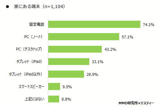 「あなたの家にある端末をすべてお選びください」との質問に対しては、「固定電話」が74.1%、「PC(ノート)」57.1%、「PC(デスクトップ)」43.2%という結果となった。