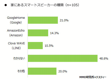スマートスピーカーが自宅にあると回答した105人(所有率9.5%)にその種類を聞いたところ、「Google Home(Google)」が21.0%、「Amazon Echo(Amazon)」が14.3%、「Clova WAVE(LINE)」が10.5%となった(複数回答可)。なお、「わからない」が48.6%を占めている。