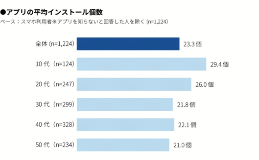 「アプリを知らない」と答えた7名を除く1,224名のアプリ平均インストール数は23.3個となった。年代別では、10代は29.4個、20代は26.0個、30代が21.8個、40代は22.1個、50代は21.0個であり、おおむね年代が低いほどインストールしている個数が多くなる傾向にある。