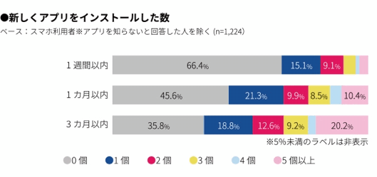 新しいアプリをインストールする頻度を確認する目的で、調査実施日から1週間以内/1か月以内/3か月以内に新しくアプリをインストールした回数を聞いたものがこちら。