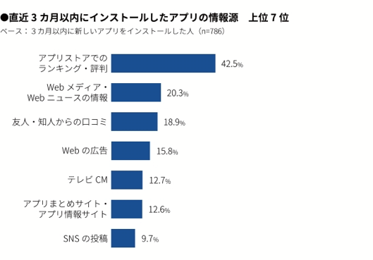 直近3か月以内に新しくインストールしたアプリについて、どこでその情報を知ったかを聞いたところ、「アプリストアでのランキング・評判」が42.5%となり、2位以下に2倍以上の差をつけた。2番目に多かったのは「Webメディア・Webニュースでの情報」で20.3%。次いで「友人・知人からの口コミ」で18.9%。