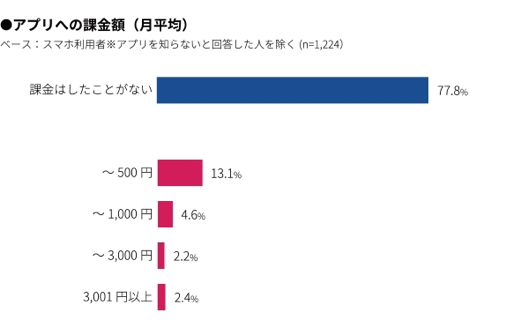 最も多かったのは「課金はしたことがない」(*)で、77.8%が該当した。残り22.2%のアプリ課金経験者における平均課金額は1,680円。