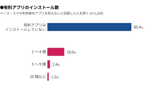 また、有料アプリ(インストール時にお金がかかるアプリ)のインストール個数を聞いたところ、最も多かったのは「有料アプリはインストールしていない」で、80.4%が該当した。有料アプリをインストールしている240名の中で、5個以上の有料アプリをインストールしている人は18%であった。