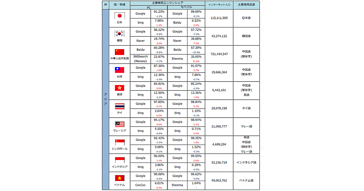 韓Naver、中Shenma、露YANDEXがシェアを伸ばす