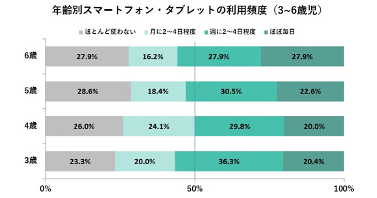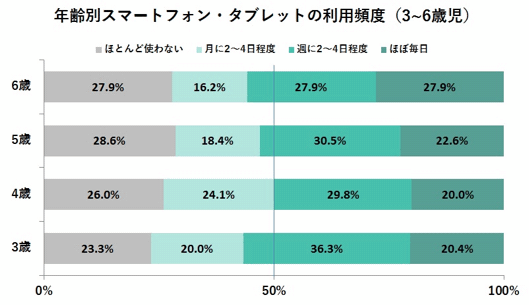 スマートフォン/タブレットの利用頻度を聞いたところ、「ほぼ毎日」(右側の深緑)と「週に2~4日程度」(緑)の合算は3歳以上の各年齢でおおむね5割を超える結果となった。子どもがスマートフォンないしタブレットを日常的に利用しているようすがうかがえる。