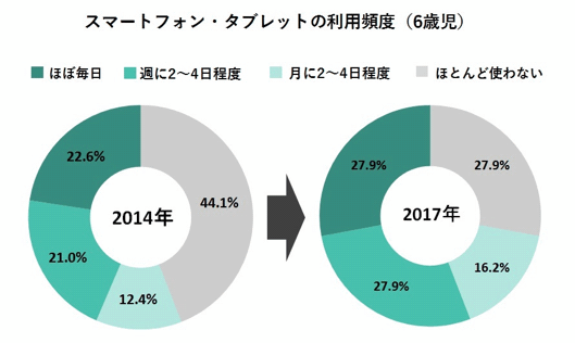 このうち、小学校入学前の6歳児の利用頻度を2014年と2017年(今回)で比較すると、「ほとんど使わない」が44.1%から27.9%に減少していた。