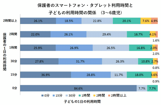 上図において、右側のピンクは「2時間以上」、黄色は「2時間」、緑は「1時間」を示すが、保護者の利用時間の長い上段ほど、この3色の比率が高い。たとえば保護者が1時間利用している場合、その子どもが1時間以上利用する割合は20.8%だが、保護者が2時間以上使用している場合、子どもが1時間以上利用する割合は32.6%となる。